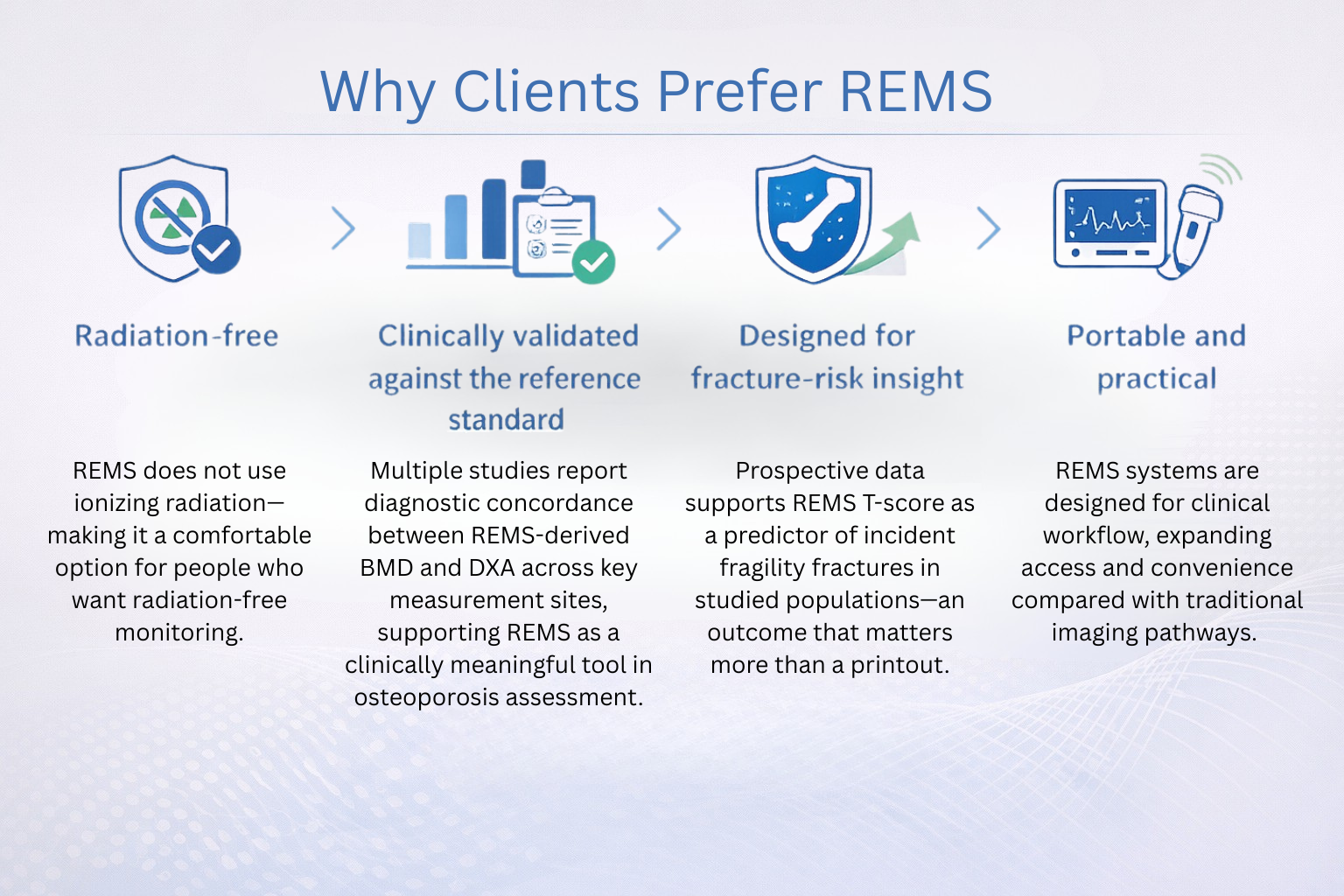 Bone health isn’t just about a single number—it’s about risk, trend, and timing. REMS was developed to help clinicians and patients evaluate bone status using ultrasound radiofrequency signals, with the goal of providing reliable assessment without exposure to ionizing radiation.